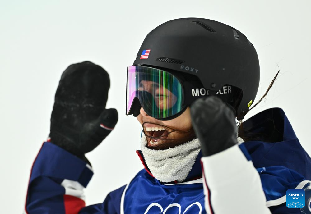 Chloe Kim of the United States celebrates during the women's snowboard halfpipe final at the Milan-Cortina 2026 Olympic Winter Games in Livigno, Italy, Feb. 12, 2026. (Xinhua/Zhang Hongxiang)