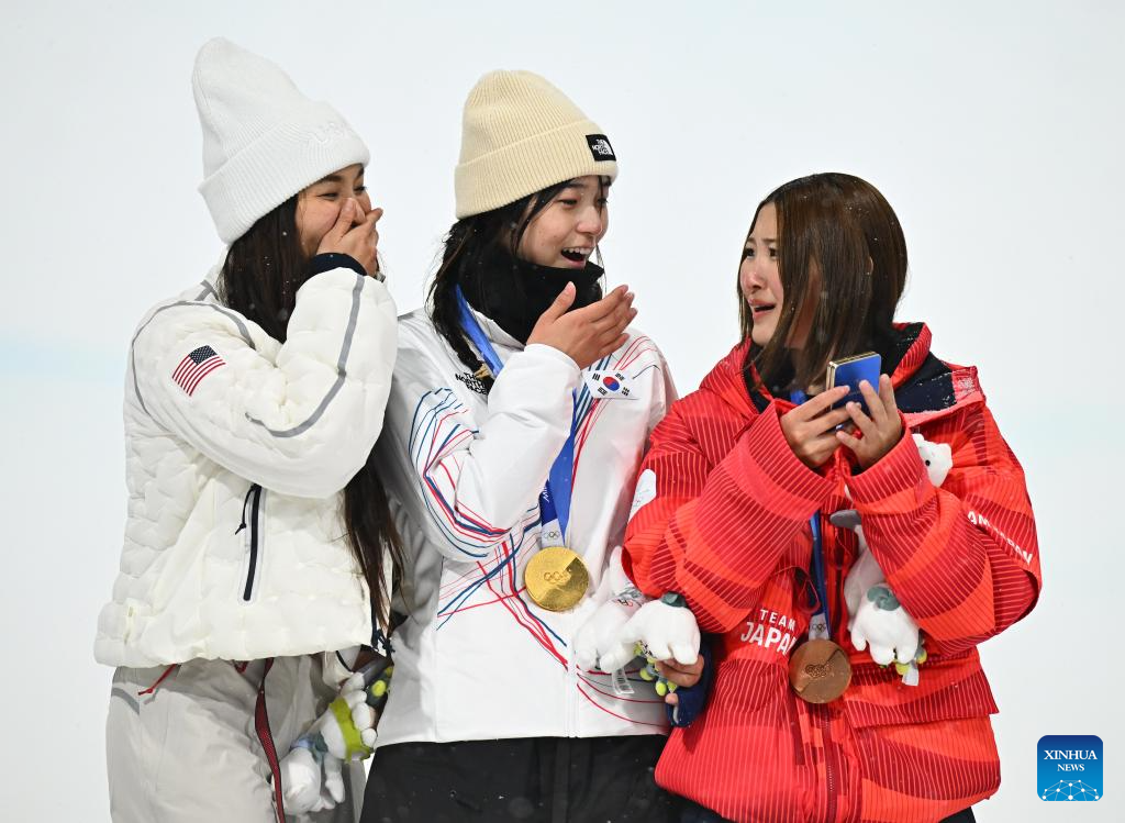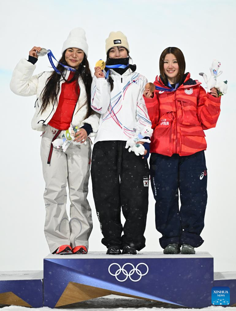 Gold medalist Choi Gaon (C) of South Korea, silver medalist Chloe Kim (L) of the United States and bronze medalist Ono Mitsuki of Japan pose on the podium after the women's snowboard halfpipe final at the Milan-Cortina 2026 Olympic Winter Games in Livigno, Italy, Feb. 12, 2026. (Xinhua/Zhang Hongxiang)
