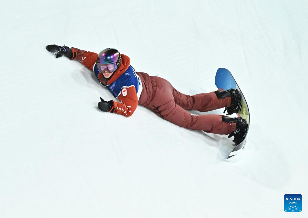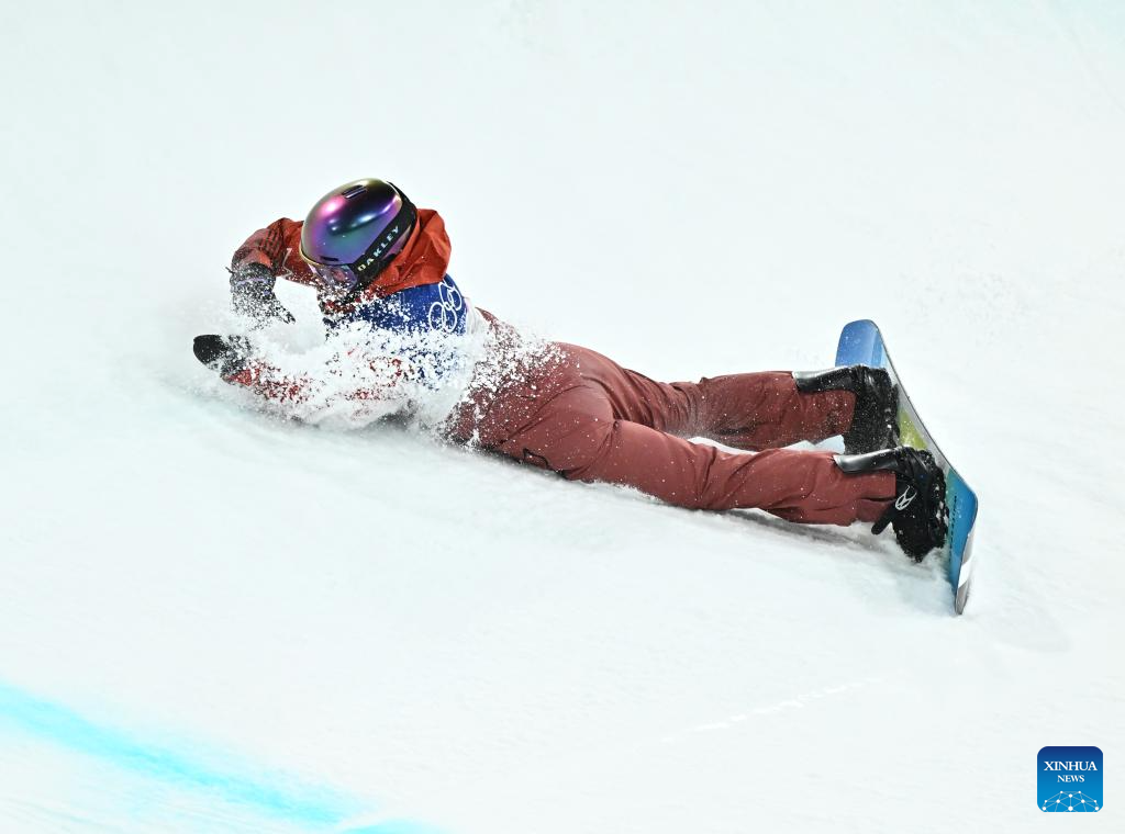Elizabeth Hosking of Canada falls during during the women's snowboard halfpipe final at the Milan-Cortina 2026 Olympic Winter Games in Livigno, Italy, Feb. 12, 2026. (Xinhua/Zhang Hongxiang)
