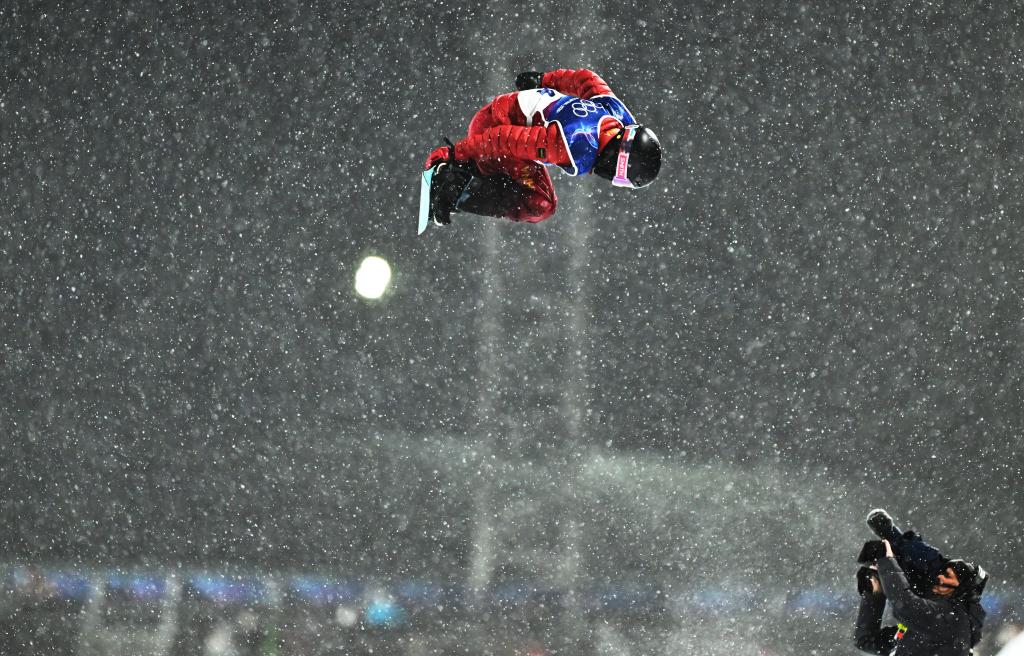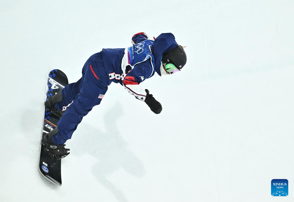 Chloe Kim of the United States competes during the women's snowboard halfpipe final at the Milan-Cortina 2026 Olympic Winter Games in Livigno, Italy, Feb. 12, 2026. (Xinhua/Zhang Hongxiang)