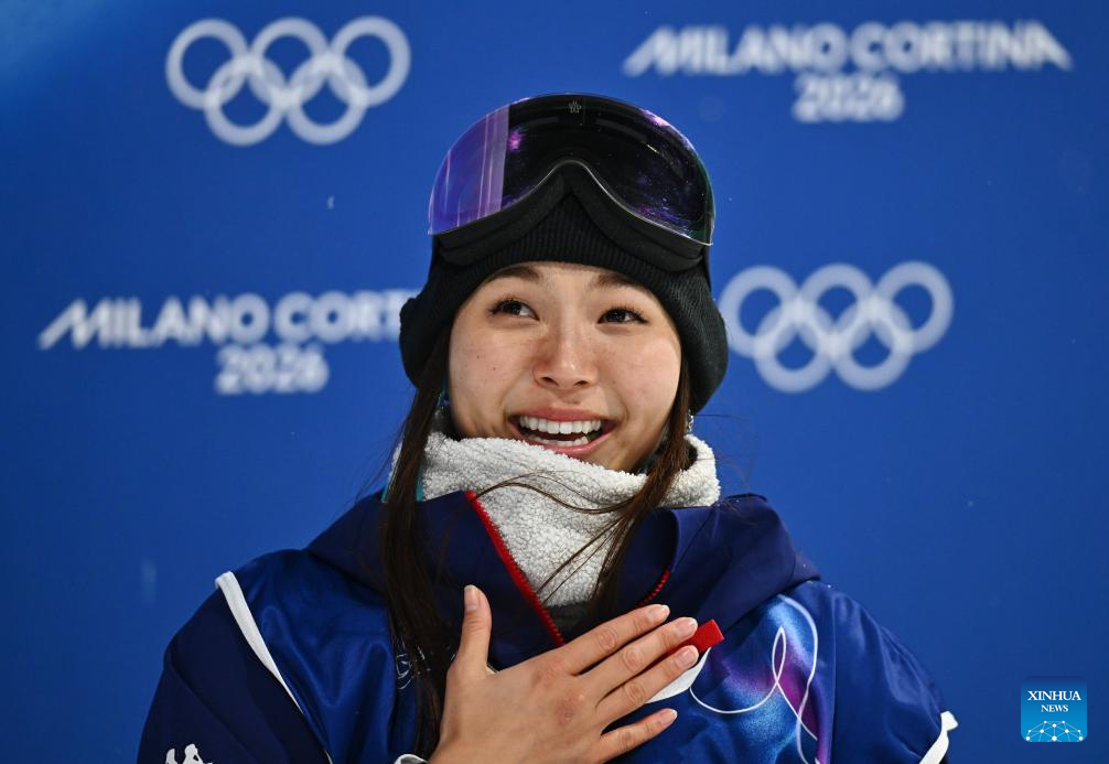 Chloe Kim of the United States reacts during the women's snowboard halfpipe final at the Milan-Cortina 2026 Olympic Winter Games in Livigno, Italy, Feb. 12, 2026. (Xinhua/Zhang Hongxiang)
