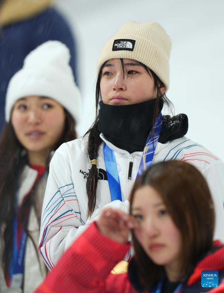 Choi Gaon (C) of South Korea sheds tears during the awarding ceremony of the women's snowboard halfpipe final at the Milan-Cortina 2026 Olympic Winter Games in Livigno, Italy, Feb. 12, 2026. (Xinhua/Xia Yifang)