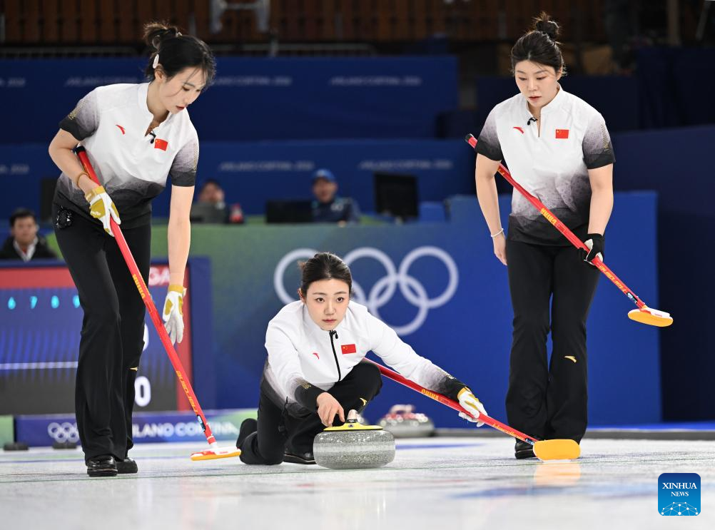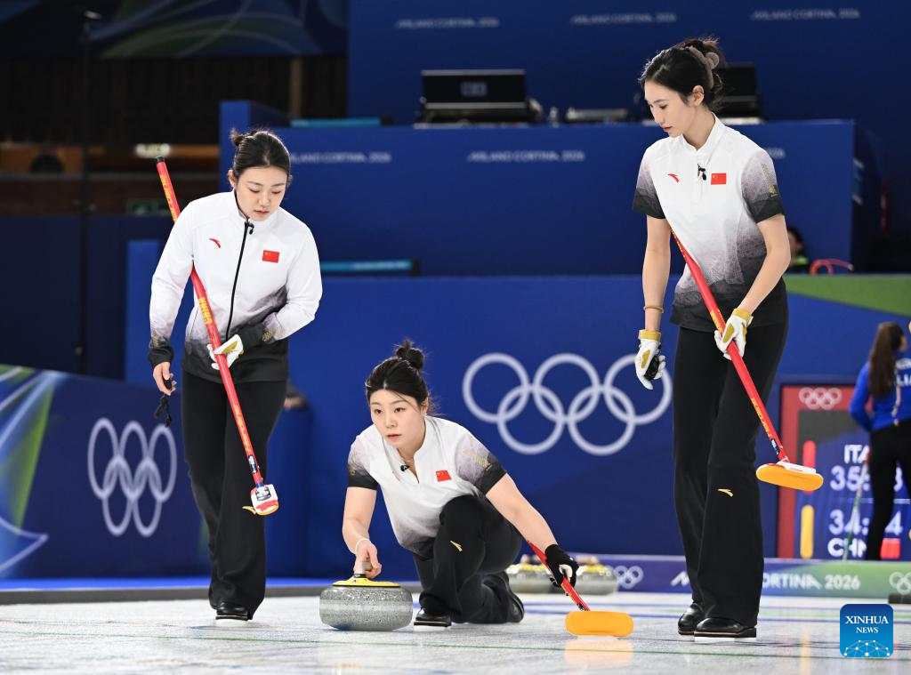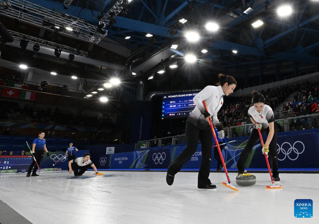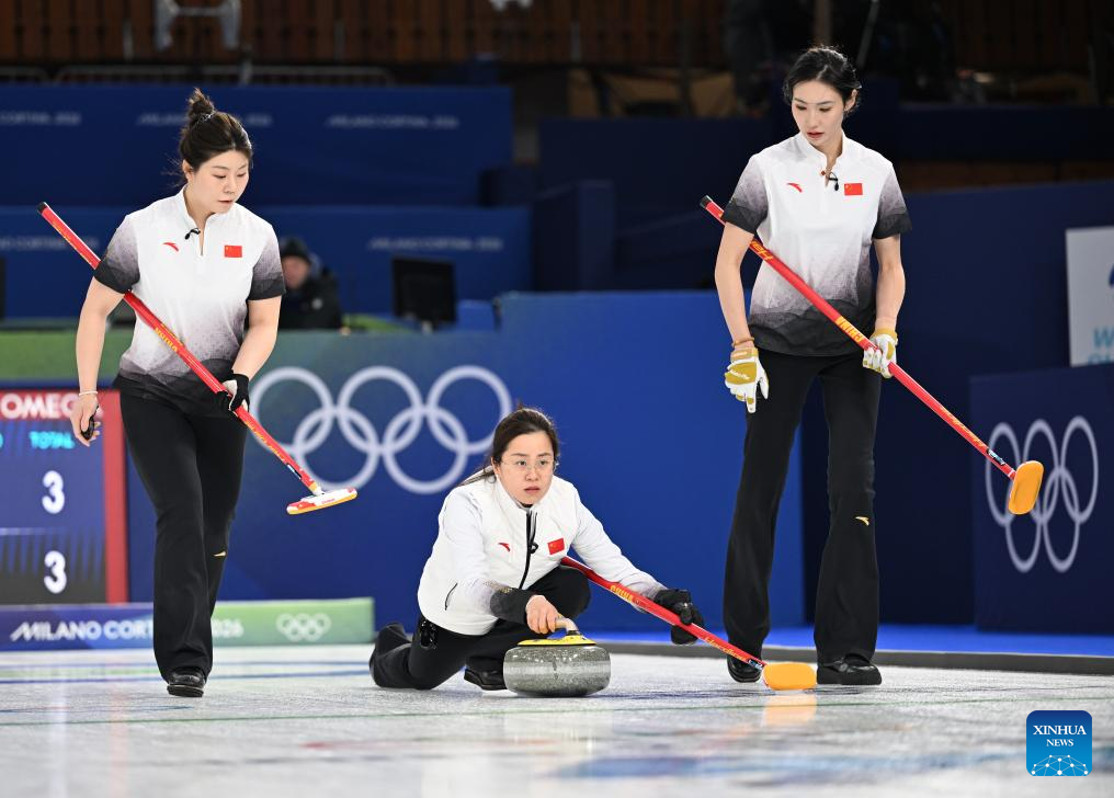 Dong Ziqi (C) of China competes during the curling women round robin session 4 match between China and Italy at the 2026 Milan-Cortina Winter Olympics in Cortina, Italy, Feb. 14, 2026. (Xinhua/Lian Yi)