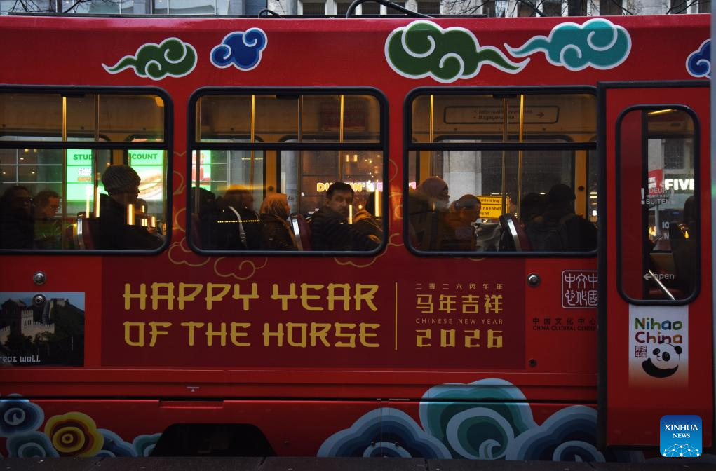 A tram decorated to celebrate the upcoming Chinese New Year is pictured in The Hague, the Netherlands, on Feb. 11, 2026. The tram has debuted on the busiest urban tram line in The Hague, bringing the festive spirit of the Chinese New Year to local residents. (Xinhua/Shao Haijun)