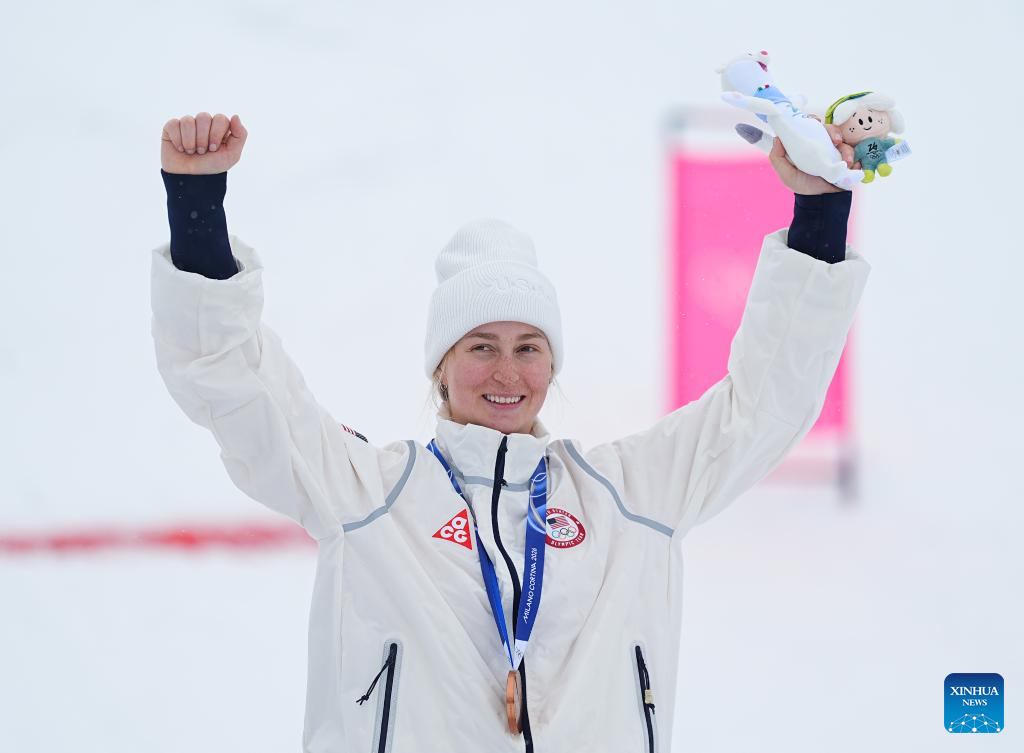 Bronze medalist Elizabeth Lemley of the United States reacts during the awarding ceremony for the freestyle skiing women's dual moguls at the Milan-Cortina 2026 Olympic Winter Games in Livigno, Italy, Feb. 14, 2026. (Xinhua/Wu Huiwo)