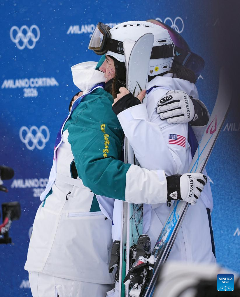 Jakara Anthony (L) of Australia hugs Jaelin Kauf of the United States after winning the freestyle skiing women's dual moguls big final at the Milan-Cortina 2026 Olympic Winter Games in Livigno, Italy, Feb. 14, 2026. (Xinhua/Wu Huiwo)