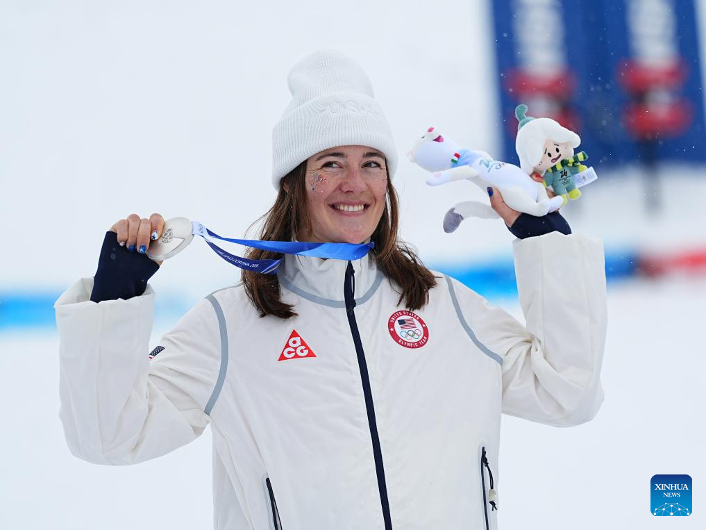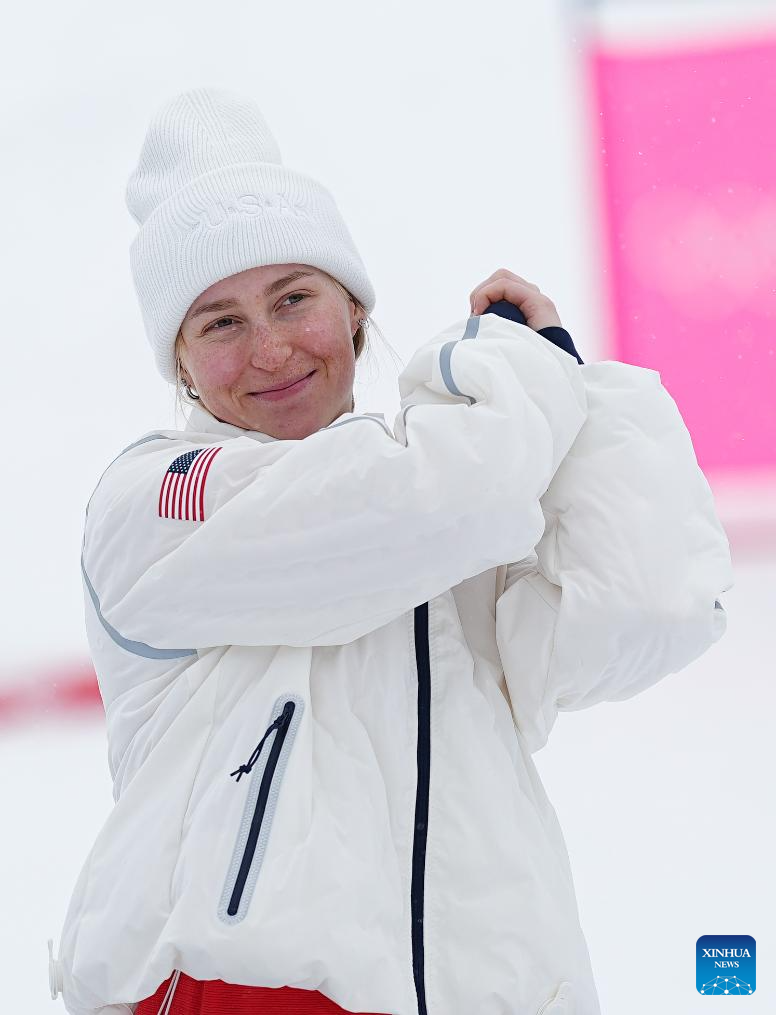 Silver medalist Jaelin Kauf of the United States poses for photos with the medal during the awarding ceremony for the freestyle skiing women's dual moguls at the Milan-Cortina 2026 Olympic Winter Games in Livigno, Italy, Feb. 14, 2026. (Xinhua/Wu Huiwo)