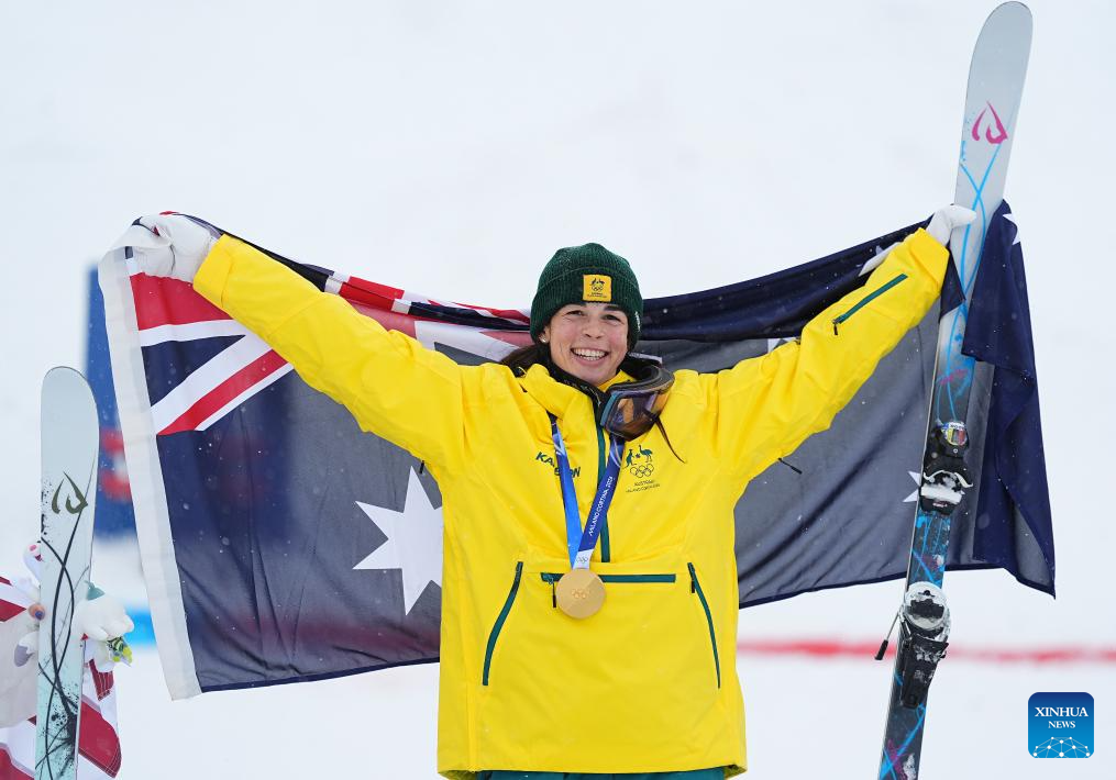 Gold medalist Jakara Anthony of Australia poses for photos with the medal during the awarding ceremony for the freestyle skiing women's dual moguls at the Milan-Cortina 2026 Olympic Winter Games in Livigno, Italy, Feb. 14, 2026. (Xinhua/Wu Huiwo)
