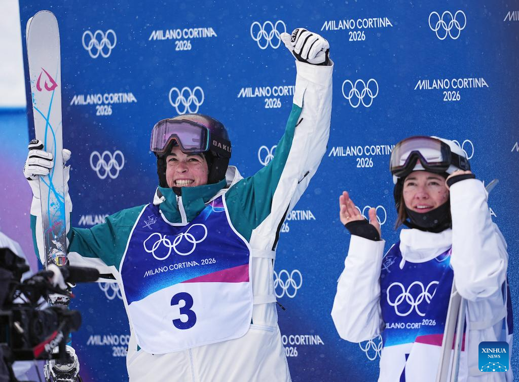 Jakara Anthony (L) of Australia celebrates after winning the freestyle skiing women's dual moguls big final at the Milan-Cortina 2026 Olympic Winter Games in Livigno, Italy, Feb. 14, 2026. (Xinhua/Wu Huiwo)