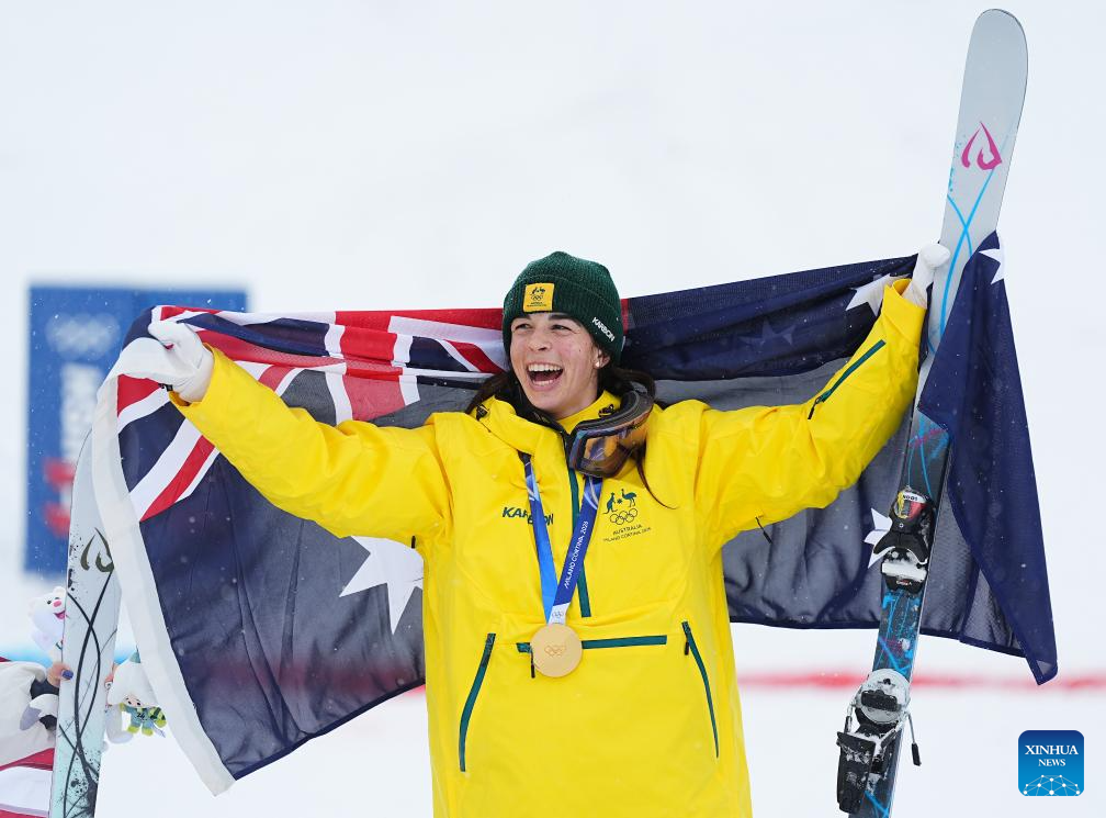 Gold medalist Jakara Anthony of Australia poses for photos during the awarding ceremony for the freestyle skiing women's dual moguls at the Milan-Cortina 2026 Olympic Winter Games in Livigno, Italy, Feb. 14, 2026. (Xinhua/Wu Huiwo)