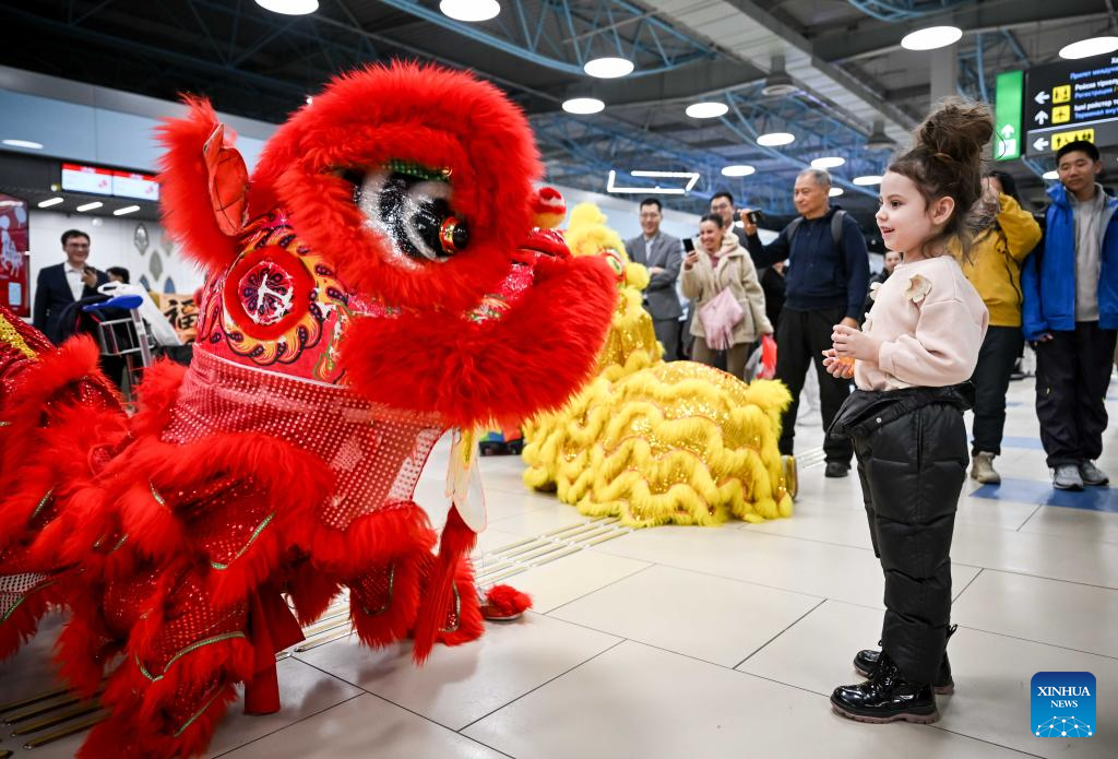 A lion dance performance is staged during a Chinese New Year cultural event at the Almaty International Airport in Almaty, Kazakhstan, Feb. 13, 2026. (Xinhua/Li Renzi)