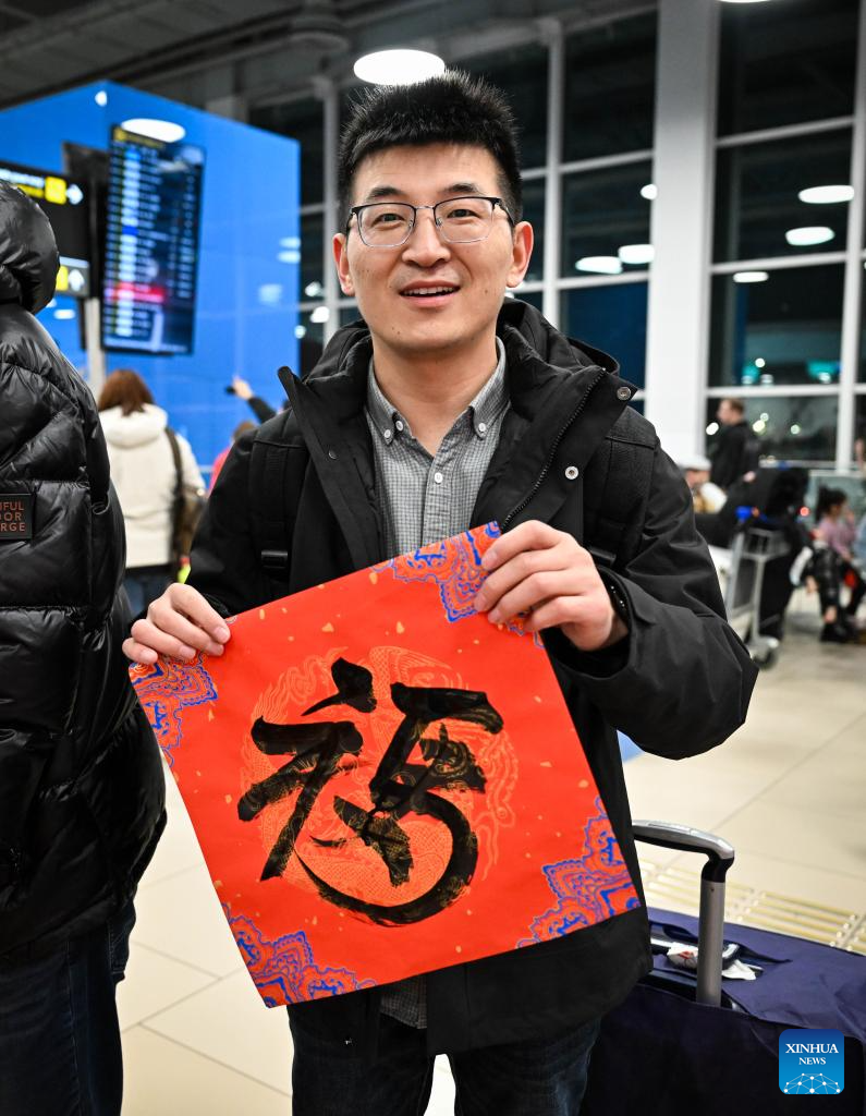A Chinese passenger displays Chinese character "Fu" (meaning good fortune) during a Chinese New Year cultural event at the Almaty International Airport in Almaty, Kazakhstan, Feb. 13, 2026. (Xinhua/Li Renzi)