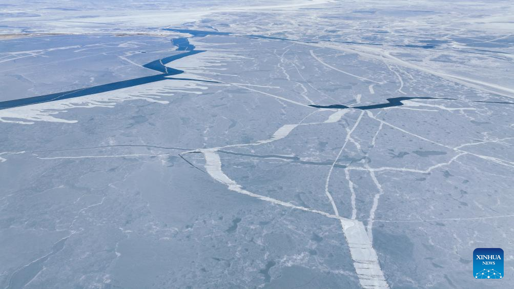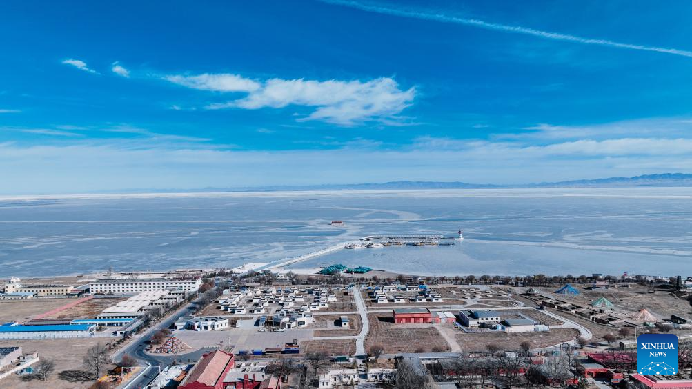 An aerial drone photo taken on Feb. 14, 2026 shows a view of Qinghai Lake in northwest China's Qinghai Province. Qinghai Lake, China's largest inland saltwater lake, now covered in ice, presents a breathtaking scenery. (Xinhua/Du Xiaowei)