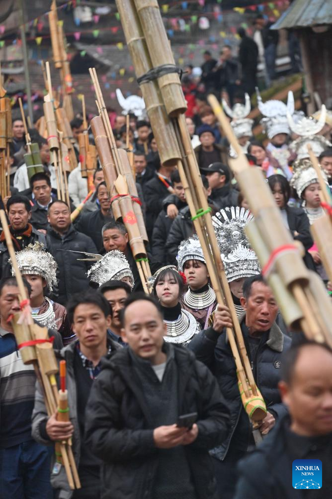 This aerial drone photo shows Miao people playing Lusheng during the "pohui" festival in a Miao ethnic village of Rongshui Miao Autonomous County, Liuzhou City, south China's Guangxi Zhuang Autonomous Region, March 7, 2026. (Photo by Long Linzhi/Xinhua)