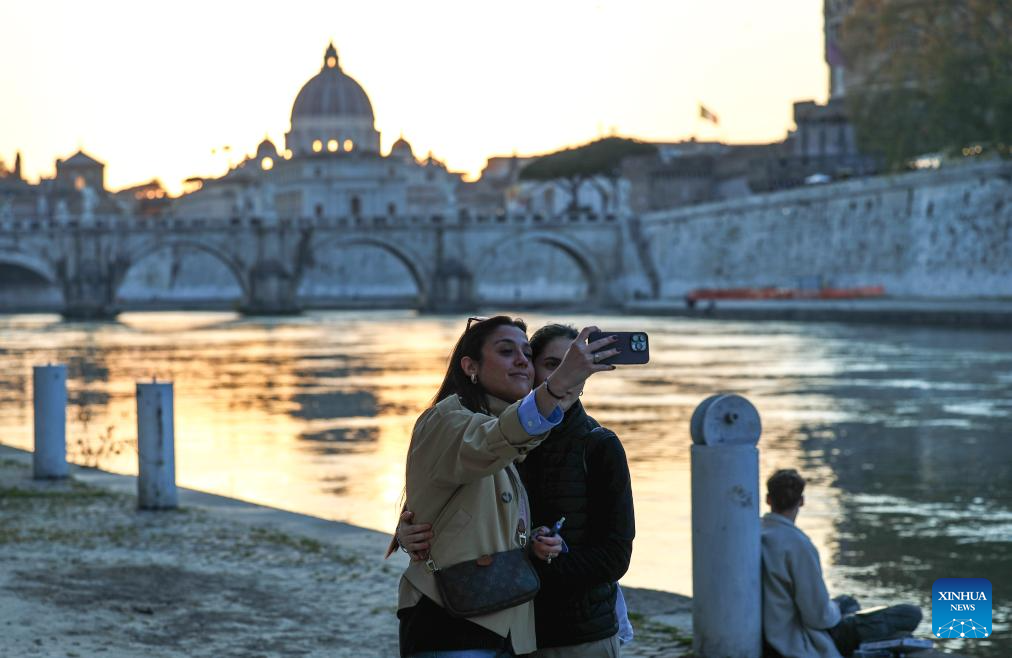 People take selfies along the Tiber River at sunset in Rome, capital of Italy, March 25, 2026. (Xinhua/Wang Kaiyan)