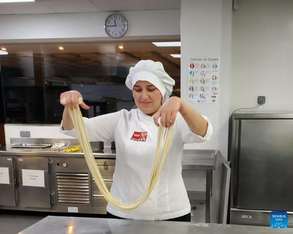 LANZHOU, March 30 (Xinhua) -- With swift and practiced hands, 42-year-old Peng Jingjing twisted, stretched and folded dough into slender strands before a dozen students at the I.E.S. Hotel Escuela in Madrid, bringing the art of hand-pulled noodles to life.