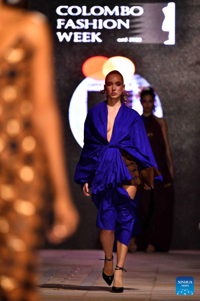 A model presents a creation during the Colombo Fashion Week in Colombo, Sri Lanka on April 1, 2026. The Colombo Fashion Week Summer 2026 takes place from April 1 to 4. The four-day event showcases creations from more than 30 designers. (Photo by Ajith Perera/Xinhua)