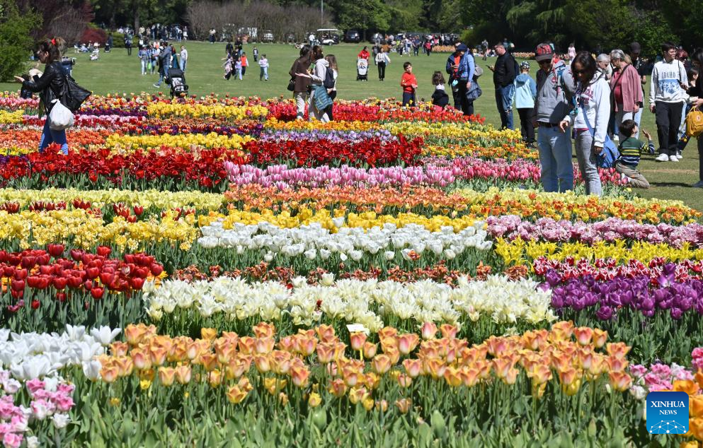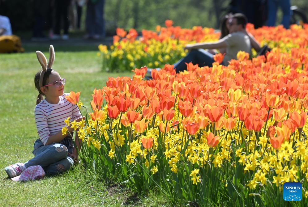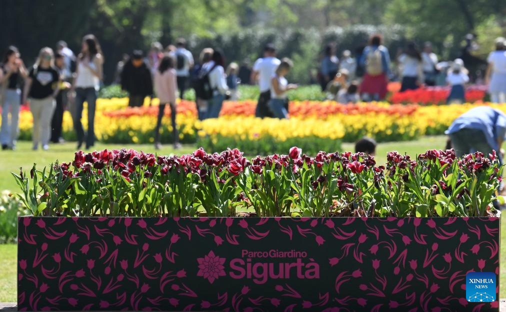 People enjoy blooming flowers at a park in Valeggio sul Mincio, Verona, Italy, April 4, 2026. (Photo by Alberto Lingria/Xinhua)
