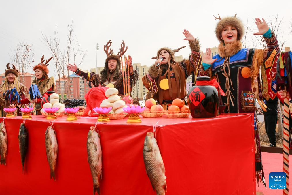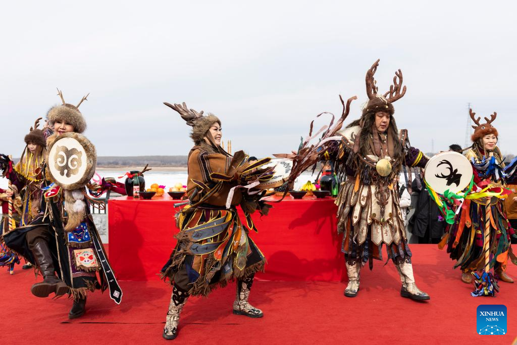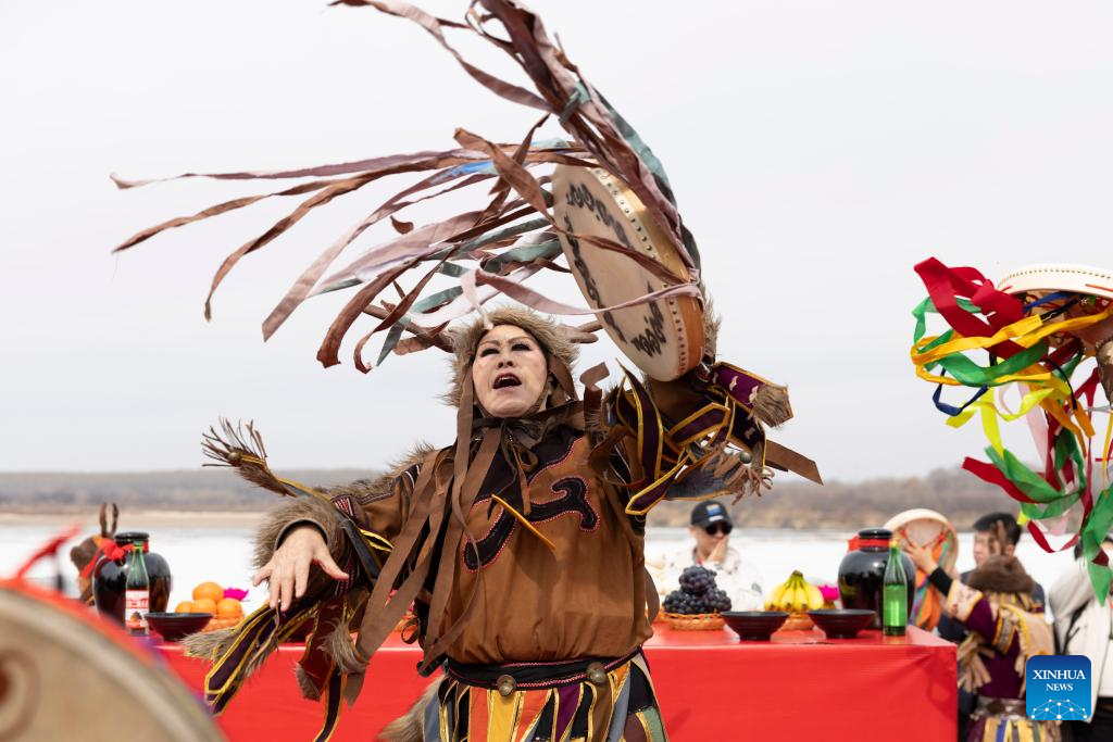 A blessing ceremony by performers from the Hezhe ethnic group is held at the Hanjiang festival in Jiamusi, northeast China's Heilongjiang Province, April 10, 2026.