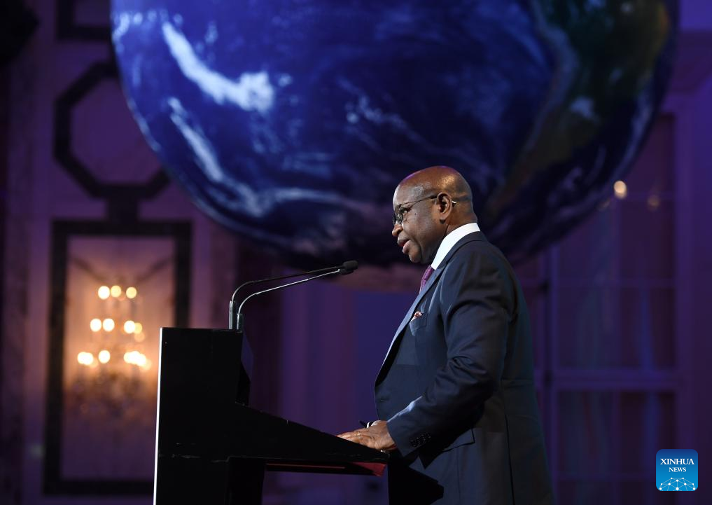 Sierra Leonean President Julius Maada Bio delivers a speech at the International Vienna Energy and Climate Forum in Vienna, Austria, April 9, 2026. Under the theme "Powering Prosperity, Security and Stability," the International Vienna Energy and Climate Forum 2026 opened here on Thursday. (Xinhua/He Canling)