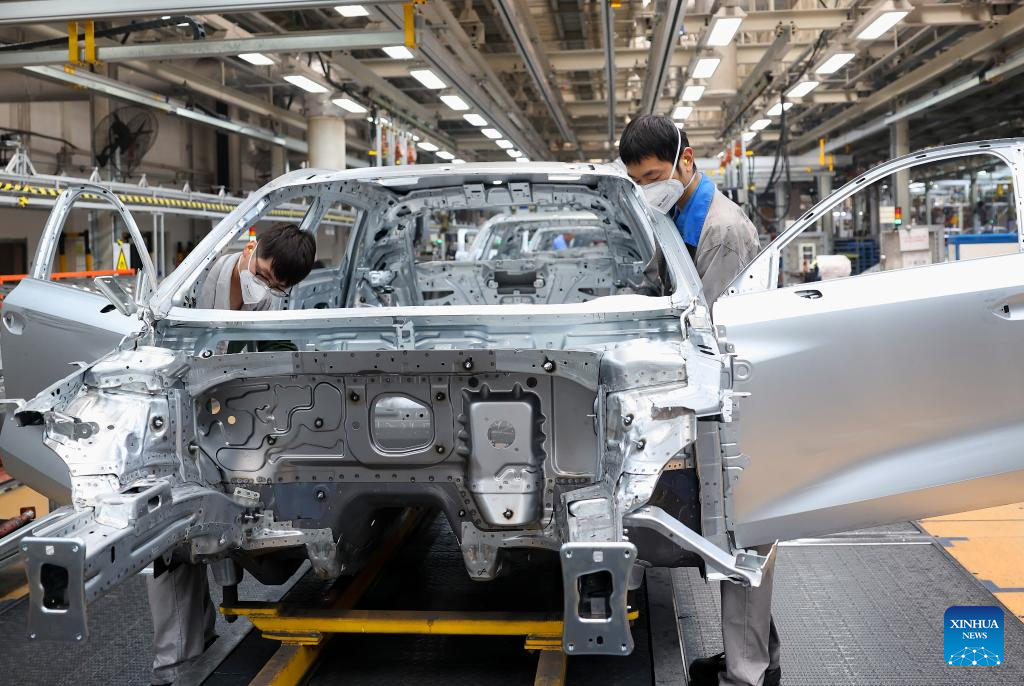 Workers operate in the welding workshop of an automobile company in Qingdao City, east China's Shandong Province, April 10, 2026.