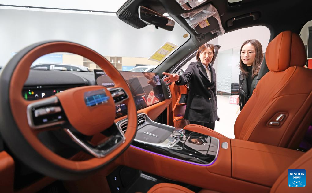 A woman learns about a new energy vehicle at a car dealership in Mengzi City, southwest China's Yunnan Province, April 10, 2026.