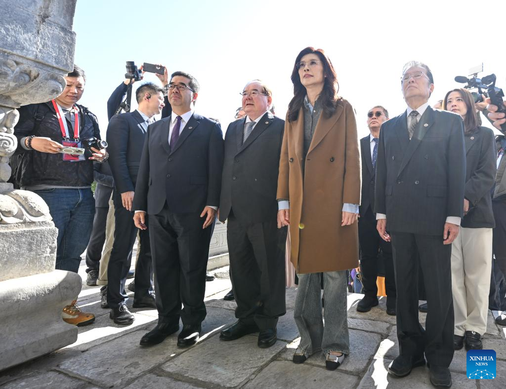 Cheng Li-wun, chairwoman of the Chinese Kuomintang (KMT) party, visits the Biyun Temple together with a KMT delegation at Fragrant Hills in the western suburbs of Beijing, capital of China, April 11, 2026. Cheng led the delegation on Saturday to pay tribute to Sun Yat-sen, a great forerunner of China's democratic revolution, at the cenotaph in Biyun Temple in Beijing. (Xinhua/Chen Yehua)