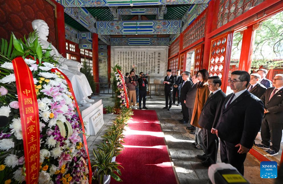 Cheng Li-wun, chairwoman of the Chinese Kuomintang (KMT) party, pays tribute to Sun Yat-sen together with a KMT delegation at the cenotaph located in Biyun Temple at Fragrant Hills in the western suburbs of Beijing, capital of China, April 11, 2026. Cheng led the delegation on Saturday to pay tribute to Sun Yat-sen, a great forerunner of China's democratic revolution, at the cenotaph in Beijing. (Xinhua/Chen Yehua)