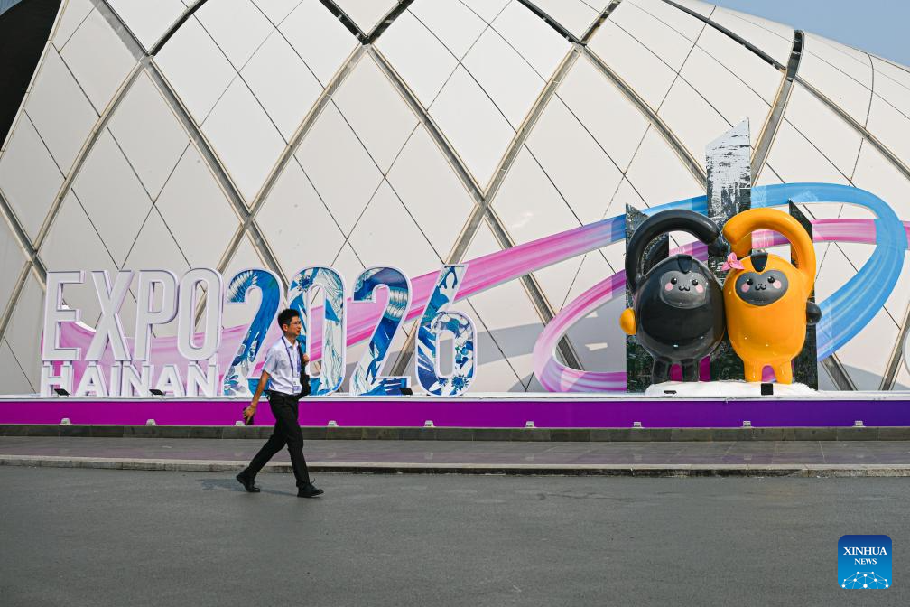 Workers hoist a mascot of the sixth China International Consumer Products Expo (CICPE) at the Hainan International Convention and Exhibition Center, the main venue for the upcoming sixth CICPE, in Haikou, south China's Hainan Province, April 10, 2026. Scheduled to take place in south China's Hainan Province from April 13 to 18, this expo will see the participation of more than 3,400 brands from over 60 countries and regions. (Xinhua/Pu Xiaoxu)