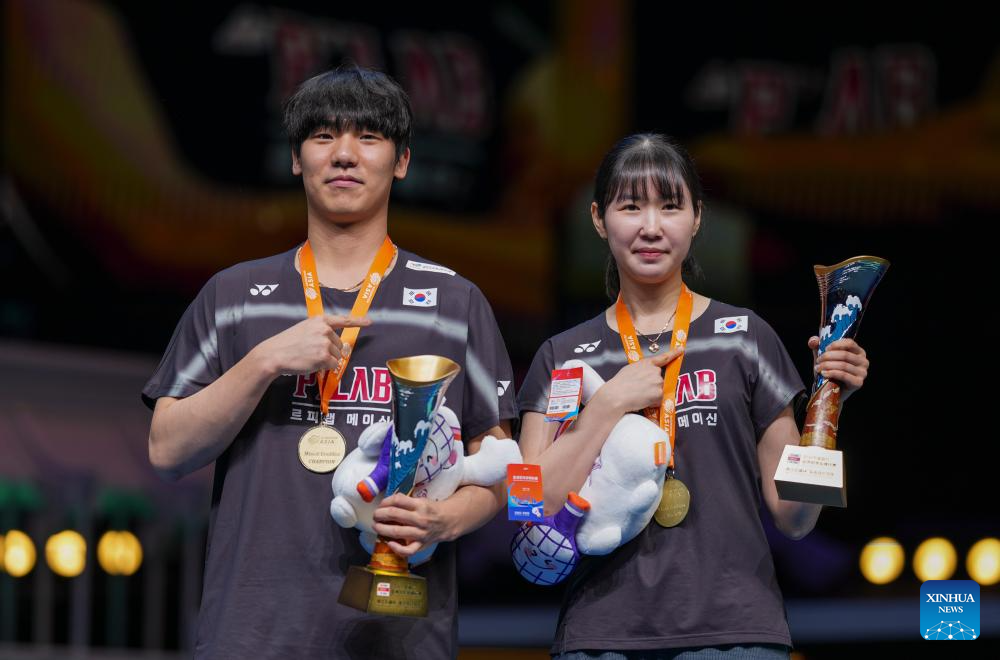 First-placed Kim Jae Hyeon (L)/Jang Ha Jeong of South Korea pose for photograph during the mixed doubles awarding ceremony at the Badminton Asia Championships 2026 in Ningbo, east China's Zhejiang Province, April 12, 2026. (Xinhua/Sun Fei)