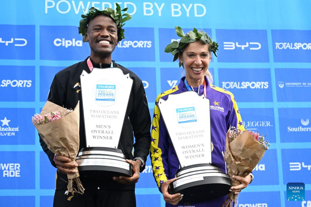 South Africa's Arthur Jantjies (L) and Gerda Steyn pose during the awarding ceremony after winning the men's and women's ultra-marathon titles at the 2026 Two Oceans Marathon in Cape Town, South Africa, on April 11, 2026. (Photo by Xabiso Mkhabela/Xinhua)
