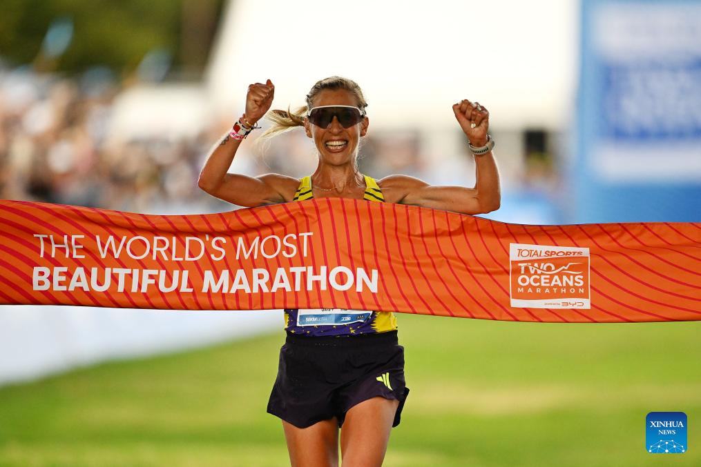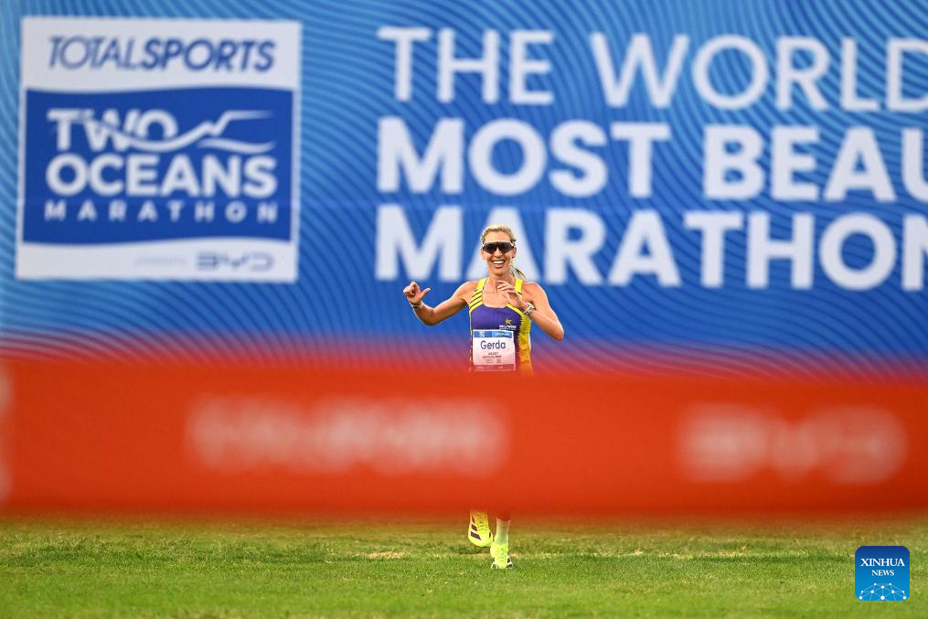 South Africa's Gerda Steyn crosses the finish line to win the women's ultra-marathon title during the 2026 Two Oceans Marathon in Cape Town, South Africa, on April 11, 2026. (Photo by Xabiso Mkhabela/Xinhua)