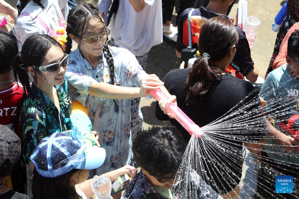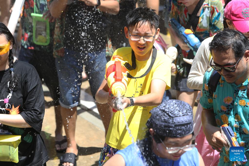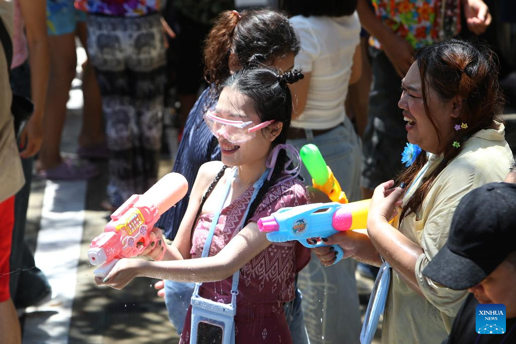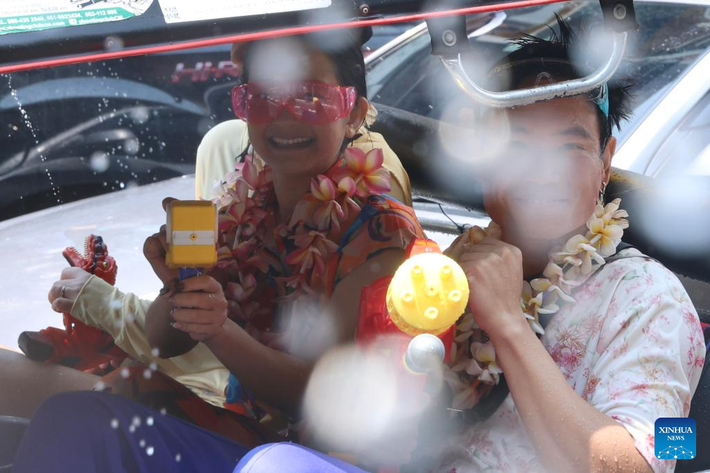 People take part in the celebration of the Songkran festival in Bangkok, Thailand, April 13, 2026. Songkran, a traditional Thai New Year festival, is celebrated from April 13 to 15 this year, during which people express greetings by splashing water on each other. (Xinhua/Rachen Sageamsak)