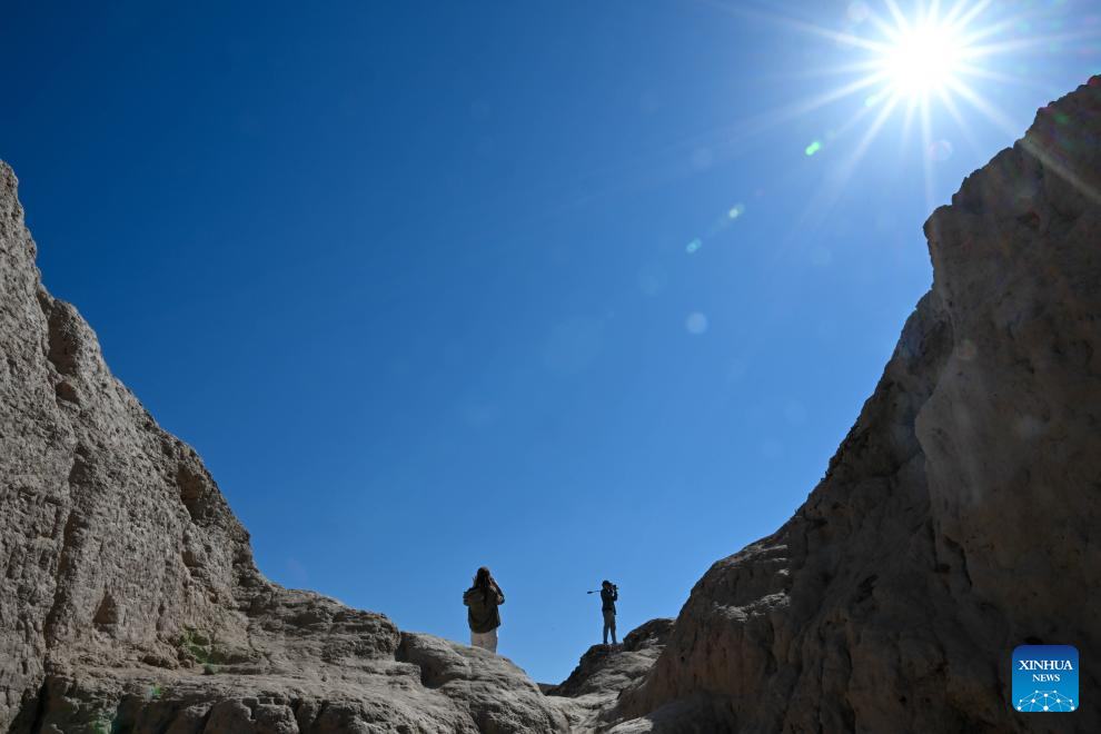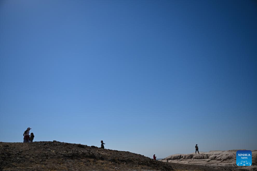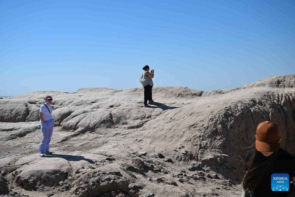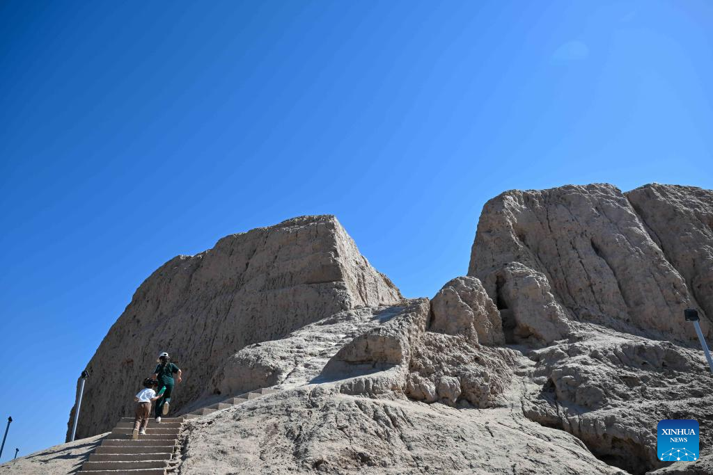 People visit the Chilpik monument near Nukus, Uzbekistan, on April 11, 2026. Located more than 40 kilometers south of Nukus, the capital of the Republic of Karakalpakstan in Uzbekistan, the Chilpik monument was an ancient Zoroastrian archaeological site and later served as a signal tower. Nowadays, It becomes one of the region's key cultural symbols and attracts crowds of visitors from home and abroad. (Xinhua/Li Renzi)