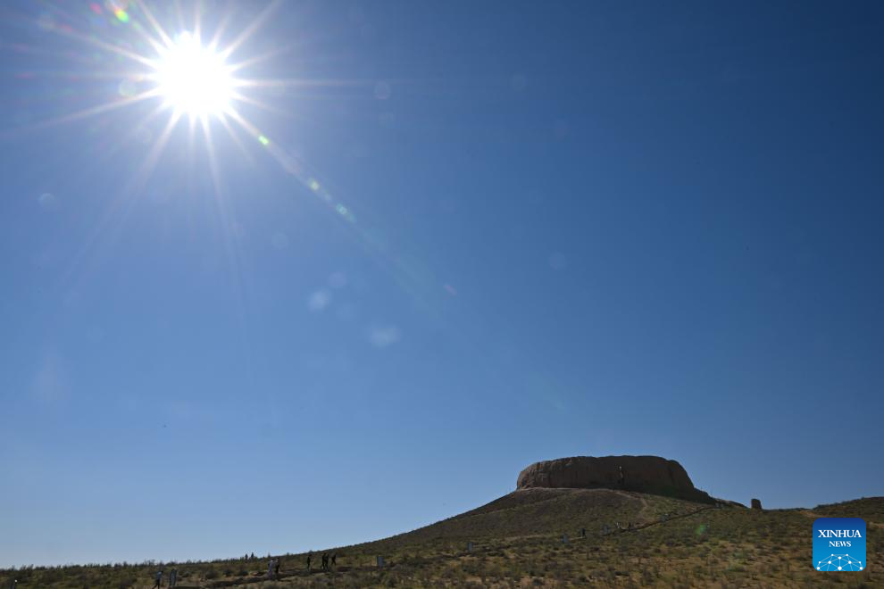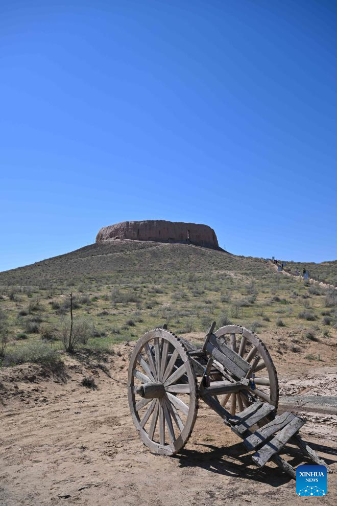 This photo taken on April 11, 2026 shows the Chilpik monument near Nukus, Uzbekistan. Located more than 40 kilometers south of Nukus, the capital of the Republic of Karakalpakstan in Uzbekistan, the Chilpik monument was an ancient Zoroastrian archaeological site and later served as a signal tower. Nowadays, It becomes one of the region's key cultural symbols and attracts crowds of visitors from home and abroad. (Xinhua/Li Renzi)