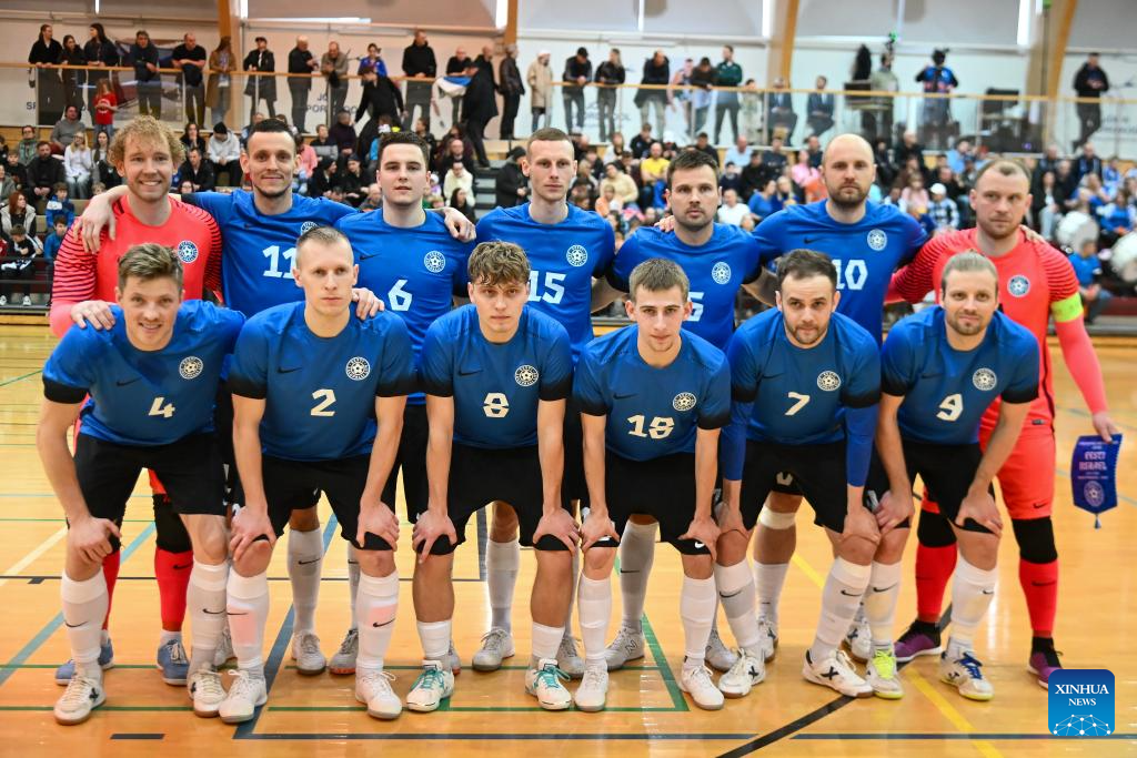 Players of Estonia pose before the 2028 FIFA Futsal World Cup preliminary round football match between Estonia and Israel in Johvi, Estonia, on April 12, 2026. (Photo by Sergei Stepanov/Xinhua)