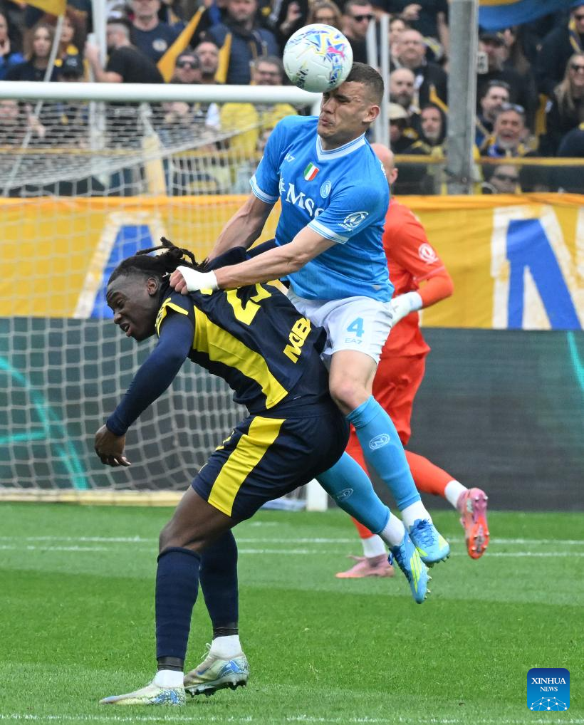 Napoli's Alessandro Buongiorno (L) vies with Parma's Christian Ordonez during a Serie A football match between Parma and Napoli in Parma, Italy, April 12, 2026. (Photo by Alberto Lingria/Xinhua)