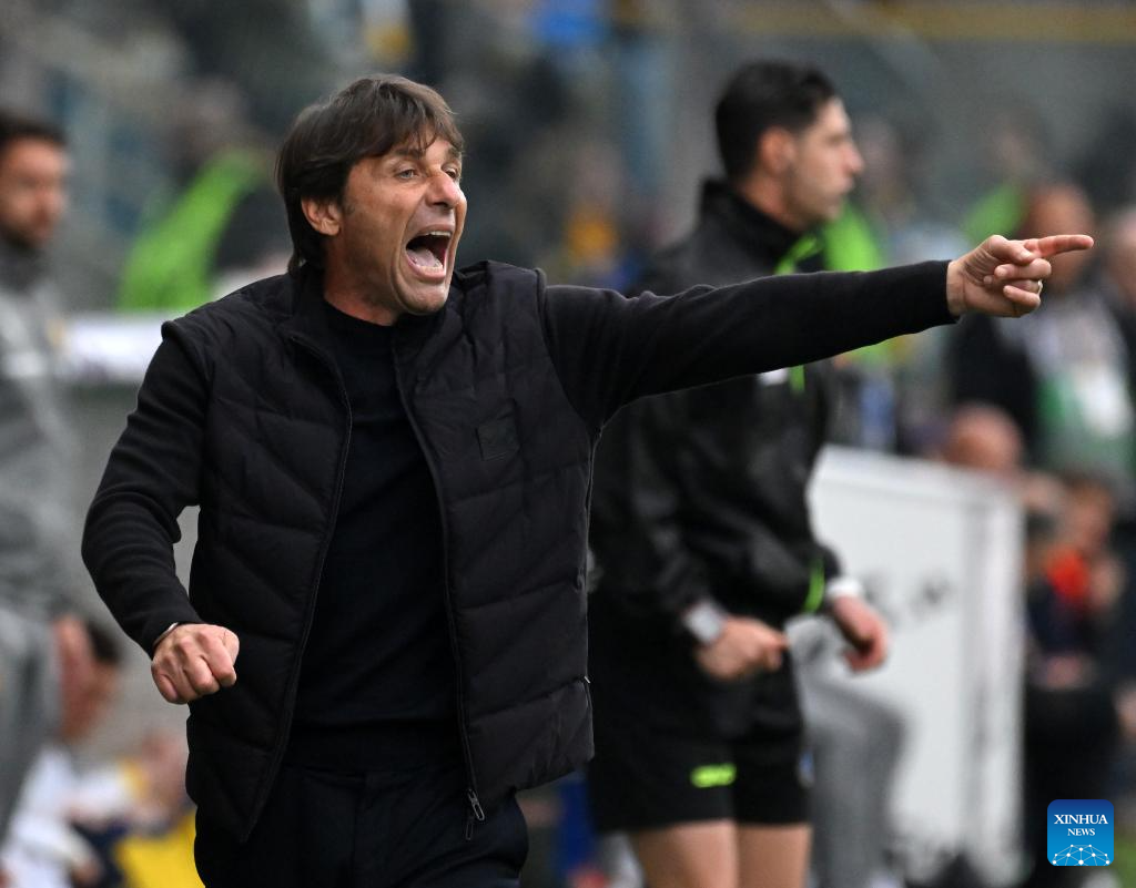 Napoli's head coach Antonio Conte gestures during a Serie A football match between Parma and Napoli in Parma, Italy, April 12, 2026. (Photo by Alberto Lingria/Xinhua)