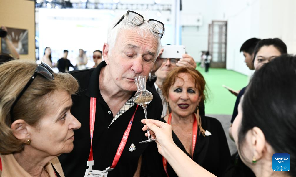 People learn about agarwood products during the sixth China International Consumer Products Expo (CICPE) in Haikou, south China's Hainan Province, April 13, 2026. Jointly hosted by China's Ministry of Commerce and the Hainan provincial government, the sixth CICPE marks the first edition of the event since the Hainan Free Trade Port fully launched island-wide special customs operations.