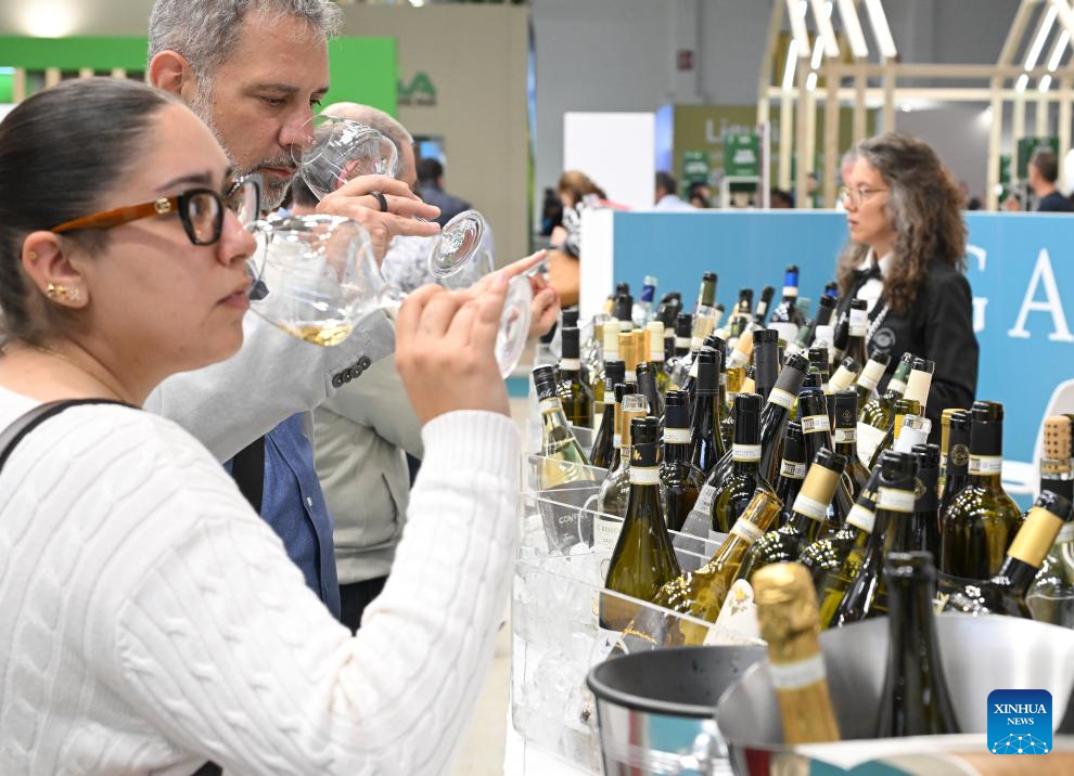 Visitors taste wine at the 58th international wine and spirits exhibition Vinitaly in Verona, Italy, April 13, 2026. Running from April 12 to 15 this year, the international wine and spirits exhibition Vinitaly, Italy's oldest and prestigious wine fair, attracts enterprises and professional visitors from nearly 130 countries and regions. (Photo by Alberto Lingria/Xinhua)