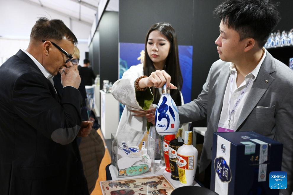 A visitor tastes Fenjiu, a type of Chinese liquor, at the 58th international wine and spirits exhibition Vinitaly in Verona, Italy, April 13, 2026. Running from April 12 to 15 this year, the international wine and spirits exhibition Vinitaly, Italy's oldest and prestigious wine fair, attracts enterprises and professional visitors from nearly 130 countries and regions. (Photo by Alberto Lingria/Xinhua)