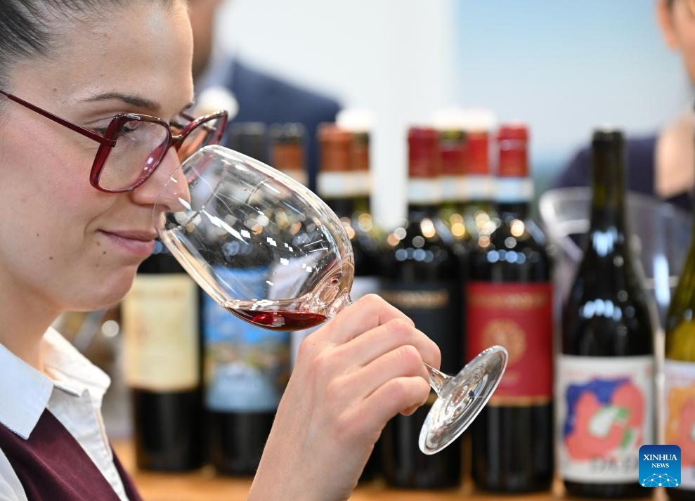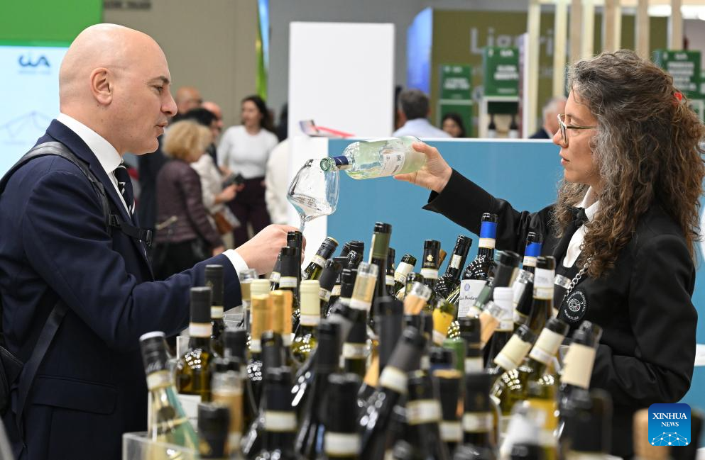 A visitor tastes wine at the 58th international wine and spirits exhibition Vinitaly in Verona, Italy, April 13, 2026. Running from April 12 to 15 this year, the international wine and spirits exhibition Vinitaly, Italy's oldest and prestigious wine fair, attracts enterprises and professional visitors from nearly 130 countries and regions. (Photo by Alberto Lingria/Xinhua)