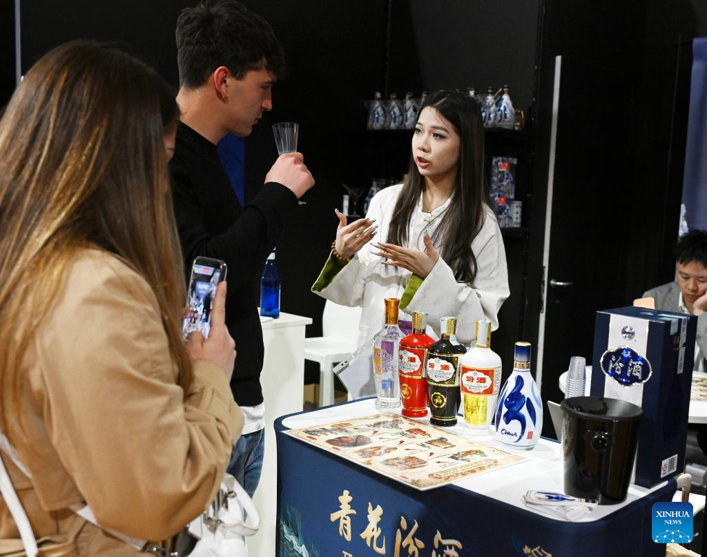 A staff member introduces Fenjiu, a type of Chinese liquor, to visitors at the 58th international wine and spirits exhibition Vinitaly in Verona, Italy, April 13, 2026. Running from April 12 to 15 this year, the international wine and spirits exhibition Vinitaly, Italy's oldest and prestigious wine fair, attracts enterprises and professional visitors from nearly 130 countries and regions. (Photo by Alberto Lingria/Xinhua)