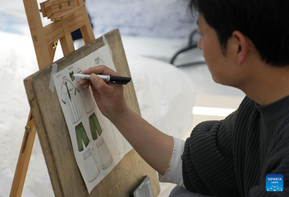 A designer draws sketches for a school uniform at a children's clothing company in Zhili Town, Huzhou City of east China's Zhejiang Province, April 13, 2026. Zhili Town in Huzhou City of east China's Zhejiang Province, has stepped up efforts in recent years in the development of its famous children's clothing industry by updating technologies, equipment and products.