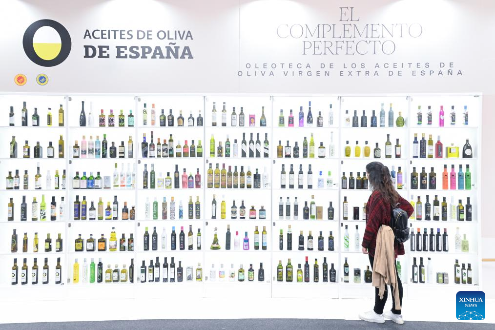 A woman stands next to an olive oil stand during the Salon Gourmets in Madrid, Spain, on April 13, 2026. The 39th Salon Gourmets will run in Madrid from April 13 to 16. (Photo by Gustavo Valiente/Xinhua)