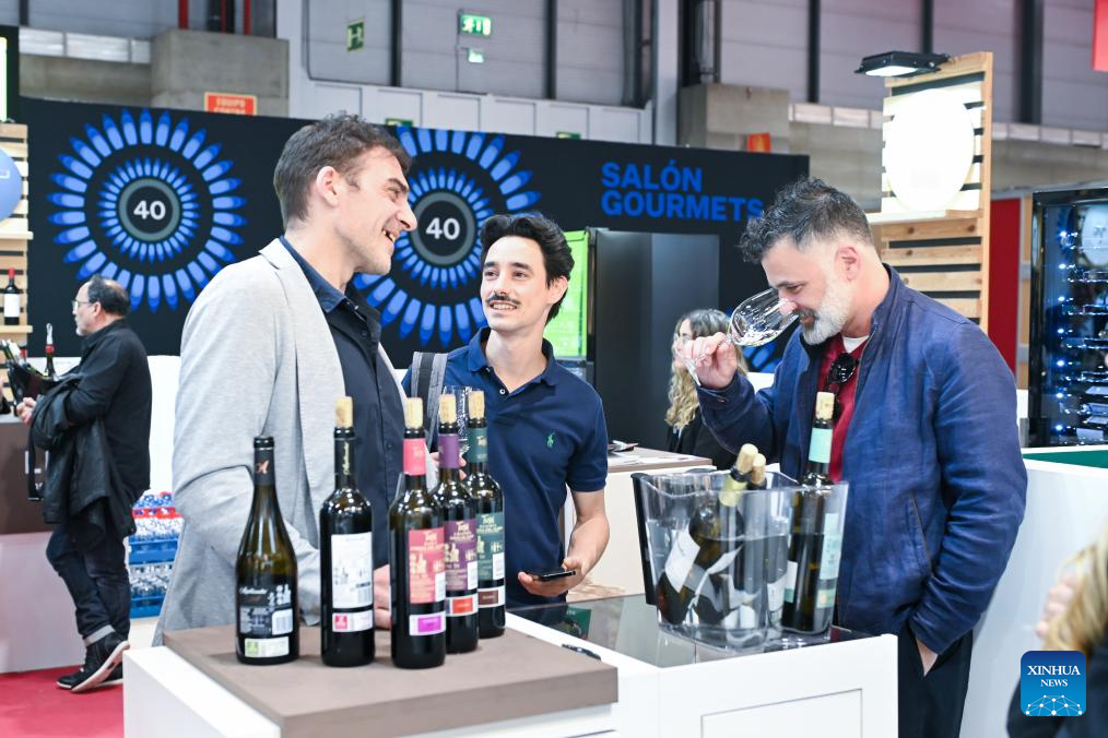 A visitor tastes wine during the Salon Gourmets in Madrid, Spain on April 13, 2026. The 39th Salon Gourmets will run in Madrid from April 13 to 16. (Photo by Gustavo Valiente/Xinhua)