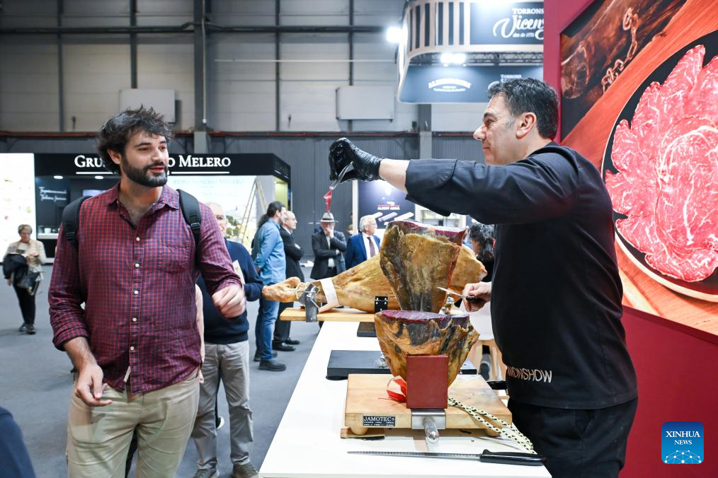 An exhibitor gives a visitor a sample of cecina during the Salon Gourmets in Madrid, Spain, on April 13, 2026. The 39th Salon Gourmets will run in Madrid from April 13 to 16. (Photo by Gustavo Valiente/Xinhua)