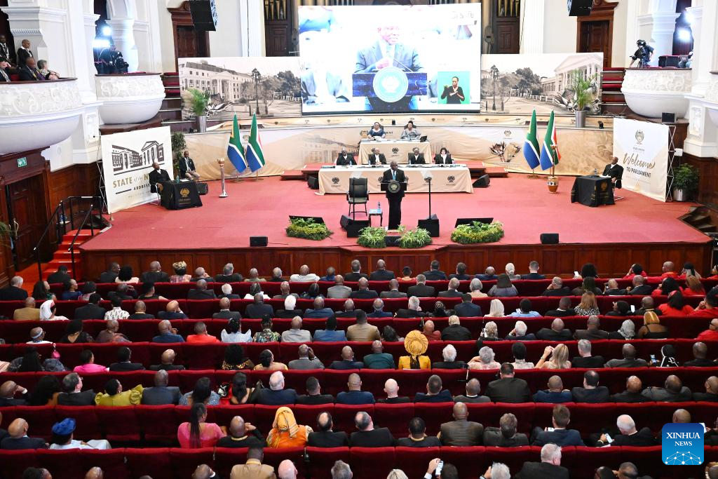 South African President Cyril Ramaphosa delivers the State of the Nation Address at the Cape Town City Hall in Cape Town, South Africa, on Feb. 12, 2026. South African President Cyril Ramaphosa announced on Thursday the decision to deploy the army to help tackle organized crime, describing it as the most immediate threat faced by the country. (Photo by Xabiso Mkhabela/Xinhua)