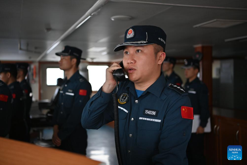 A law enforcer aboard the China Coast Guard (CCG) vessel Wanshan issues navigation orders during a patrol mission in the territorial waters of China's Huangyan Dao, Feb. 6, 2026. (Photo by Zhai Yifan/Xinhua)