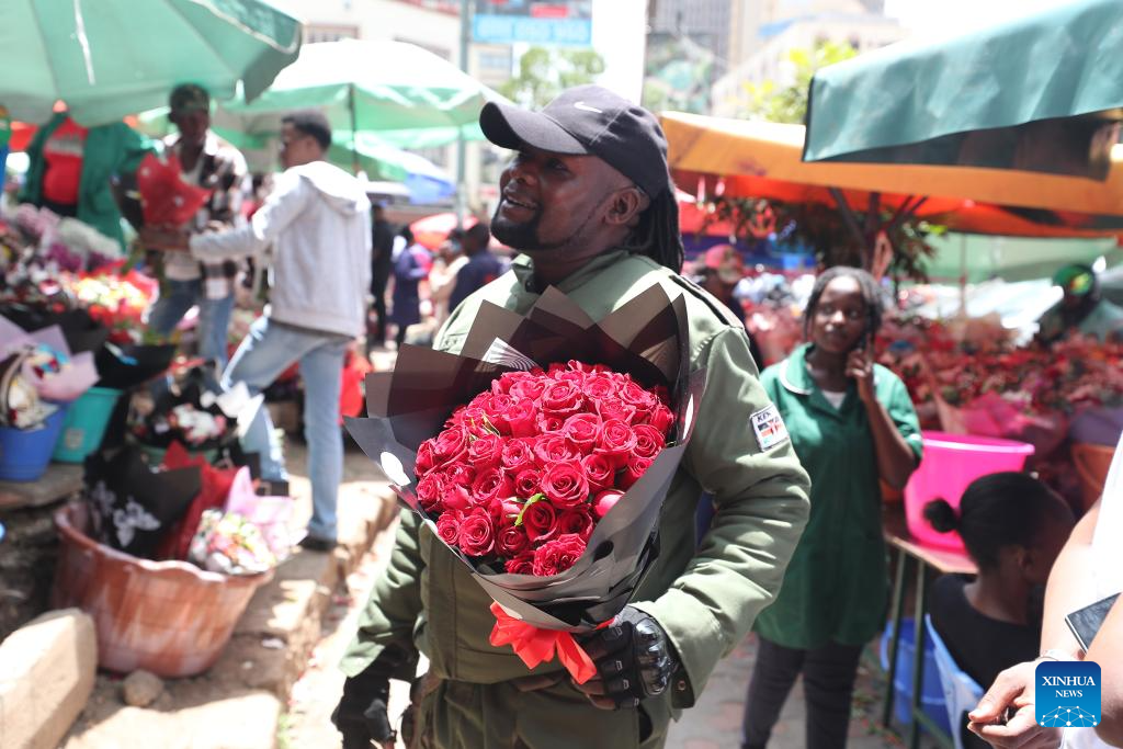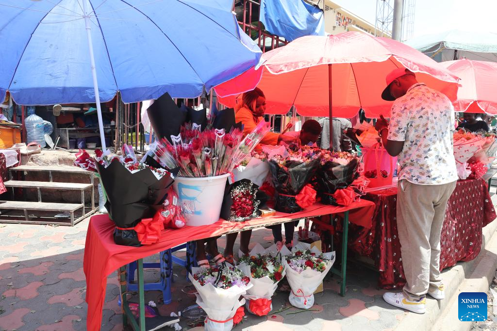 A stall sells Valentine's Day flower gifts in downtown Nairobi, Kenya, Feb. 14, 2026. (Photo by Henry Naminde/Xinhua)